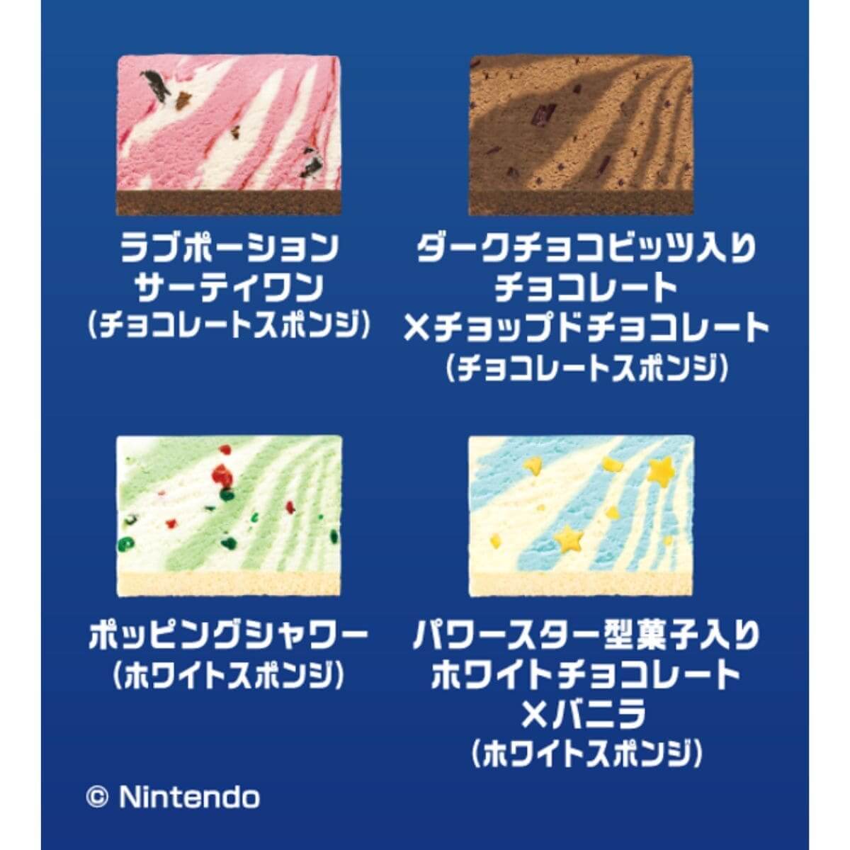 トッピングには、グランドスターがデザインされたチョコプレートや星型のチョコレート、ピックには、マリオやロゼッタ、ヨッシー、クッパなどおなじみのキャラクターたちに加えて、カラフルなチコたち、クッパJr.や星ウサギも登場!さらに、フレーバーのうち一つにはパワースター型菓子が入った特別なピースも。食べ応えも、にぎやかさも、このアイスクリームケーキならではの特徴です。