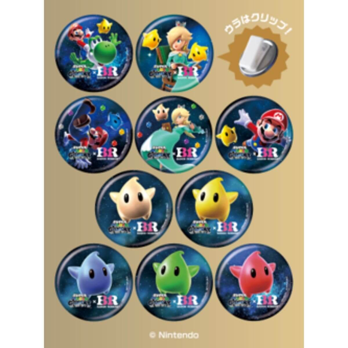 4月25日(土)より、「スーパーマリオギャラクシー ダブルカップ」または「ロゼッタ スペシャルダブルカップ」のいずれか1コご購入ごとに、『スーパーマリオギャラクシー』デザインの「オリジナル缶バッジクリップ」が1つプレゼントされます。デザインは、マリオやヨッシー、ロゼッタ、思わず全色集めたくなる色とりどりのチコたちなど全10種類で、ランダムで1つ渡されます。また、「オリジナル缶バッジクリップ」は安全ピンを使わないクリップ仕様になっているので、お子様から大人の方まで安心して使えます。