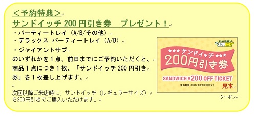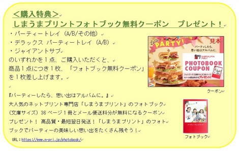 パーティーシーズンに合わせたメニューの販売に加え、今年は予約特典として「サンドイッチ200円引き券」、購入特典として「しまうまプリントのフォトブック」を展開する。