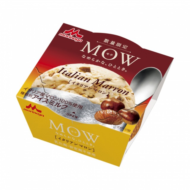 新発売のフレーバーとなる「MOW(モウ) イタリアンマロン」は、イタリア産マロンペーストを使用し、質の高い乳原料と程よく調和させたマロンアイスに、イタリア産の栗粒入りマロンソースを混ぜ込んだこれまでにない新製品。しっとり柔らかな栗粒の食感と芳醇な味わいを楽しめるようになっている。
