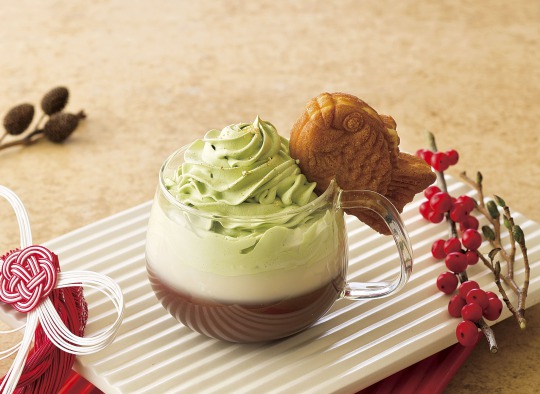 今回の新商品『プレミアムあずき豆乳ラテ ~ミニたい焼き添え~』は、こしあんベースのお汁粉に豆乳でまろやかさをプラスし、抹茶フレーバーのホイップクリームをたっぷりと絞った一品で、さらに、豆乳と抹茶フレーバーのホイップクリームの間に、エスプレッソパウダーを一振りすることで、ほのかな香りのアクセントをプラスしている。