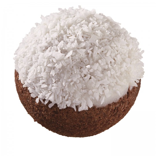 ミルクチョコレート風味の生地をホワイトチョコでコーティングし、ココナツをトッピングした。
