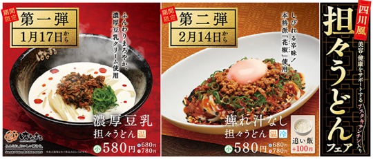 「四川風 担々うどんフェア」の第一弾は、ふんわりまろやか「濃厚豆乳担々うどん」、第二弾はしびれる辛味が特長の「痺れ汁なし担々うどん」を発売。