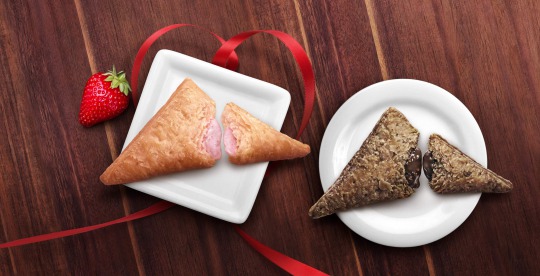 これからのバレンタインシーズンに向け、「三角いちごチョコパイ」と「三角チョコパイ 黒」の2種類のパッケージは、組み合わせるとハートのマークが表れる「胸キュン」な仕様になっている。