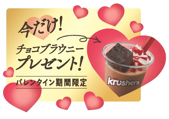 日本KFCホールディングスグループの日本ケンタッキー・フライド・チキン株式会社は、ケンタッキーからのバレンタインプレゼントとして、2017年2月1日(水)から全国のケンタッキーフライドチキン(以下:KFC)で、新食感の飲むスイーツ「Krushers(クラッシャーズ)」の冬季限定フレーバー「Krushers 贅沢ビターショコラ」2種(「フランボワーズ」、「ココアビスケット」)のいずれか購入時に「チョコブラウニー」をトッピングする「バレンタイン期間限定 今だけ!チョコブラウニープレゼント!」を実施する。