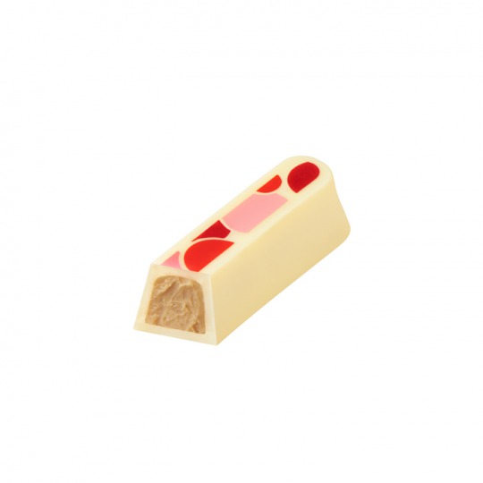 フレッシュなストロベリーとたっぷりのクリームをサンドしたエクレアをイメージした一粒。甘酸っぱいストロベリーとクリームを合わせたなめらかなガナッシュを、ホワイトチョコレートで包んだ。