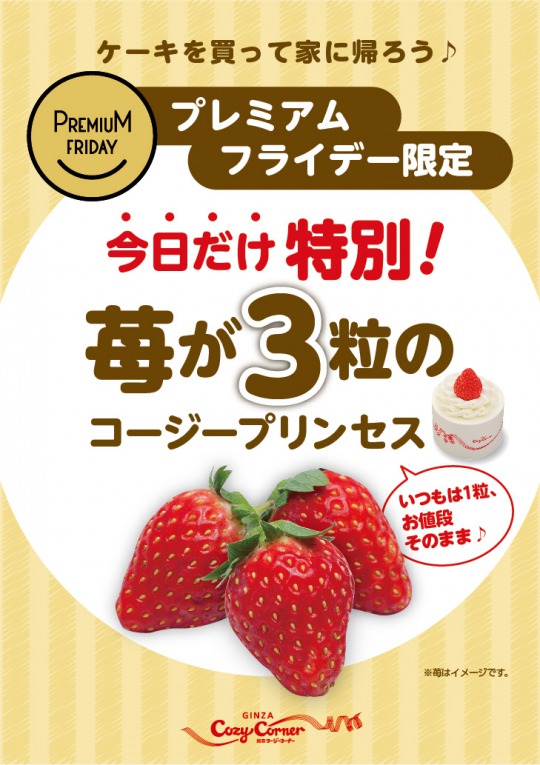 株式会社銀座コージーコーナーは、2017年2月24日(金)の『プレミアムフライデー』に、ひとりじめサイズのプチデコレーションケーキ「コージープリンセス」の“苺”を値段そのままで3粒に増量して販売する。