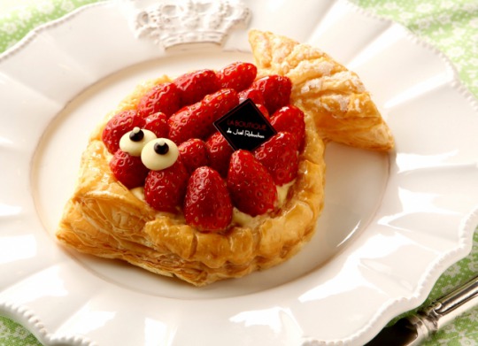 「ラ ブティック ドゥ ジョエル・ロブション」の「ポワソン ダブリル フレーズ」は、さくさくのパイに旬の苺を魚のうろこに見立てて飾り、パイ生地にアーモンドクリームとカスタードクリーム、リュバーブのコンフィチュールを合わせフレッシュの苺をのせて、甘みと酸味をバランスよく仕上げた。