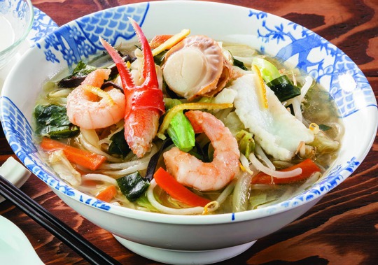 海鮮と国産野菜たっぷりのタンメン。瀬戸内の花藻塩を加え、やさしく味わい深い風味に。ゆずの香りが華やかさを演出する。