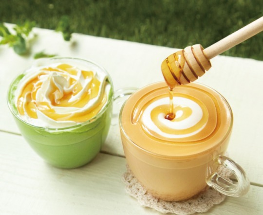 (写真左)「抹茶ハニーミルクラテ」 (HOT/ICED)Short:480円 Tall:530円 Grande:580円