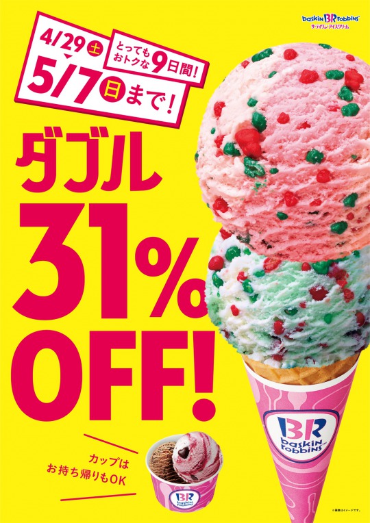 B‐Rサーティワンアイスクリーム株式会社は、「ダブルコーン・ダブルカップ31%OFFキャンペーン」を、今年もゴールデンウィーク期間中の4月29日(土・祝)~5月7日(日)の9日間実施する。