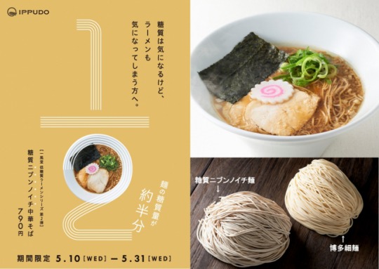 株式会社力の源ホールディングス傘下の株式会社力の源カンパニーは、日本国内の「一風堂」21店で、2017年5月10日(水)から3週間、昔なつかしい“中華そば”の味わいを低糖質で楽しめる「糖質ニブンノイチ中華そば」を発売する。