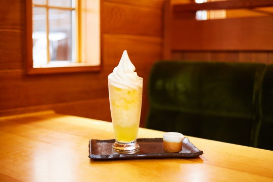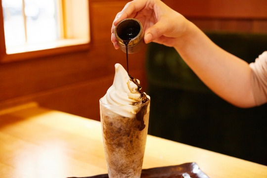 ひんやりかき氷にシロップをたっぷりかけ、仕上げに濃厚なソフトクリームをのせ、ソフトクリームとかき氷を“食べて”楽しんだ後は、少し残したかき氷に別添えの専用ジュース(シロップ)を注ぐことで“飲む”かき氷に。溶けた氷と注いだジュースがなじみ、フローズンドリンクのような味わいを楽しめるようになっている。