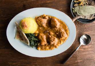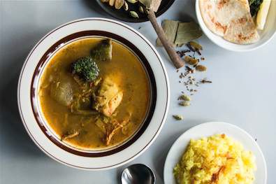 BOISHAKIでは、カレーの前に「スパイススープ」を提供する。味のベースとなるスパイスからとったお出汁に、はちみつを少し加えてほんのり甘くて身体の内側からポカポカしてくるようなスープ。それから、チキンやマトン、豆、新鮮な鱈などを具材にたっぷり使ったカレー。シェフのイスラムが、食べる人の胃腸に優しくと、お腹の調子を整えるクミンやカブリチャーナなどのスパイスがたっぷり。手作りのキャロットラペやキャベツのピクルスと一緒食べたり、マンゴーをオイルで温めて一週間熟成させた漬物「マンゴーアチャール」で味に変化をつけるのもおすすめ。