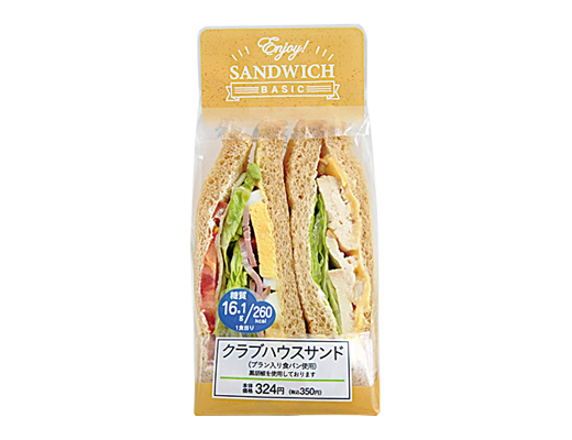 「クラブハウスサンド(ブラン入り食パン使用)」は、低糖質の食生活を意識する人などに向けて展開するブランシリーズのサンドイッチで、小麦粉・ブランの他に大豆粉等を加えた「ブラン入り食パン」表面をトーストする事で、香ばしく自然な味わいに仕上げた。シーザーサラダソースで仕上げたローストチキン層と、マスタードソースで仕上げたベーコンレタス層の組み合わせとなっている。