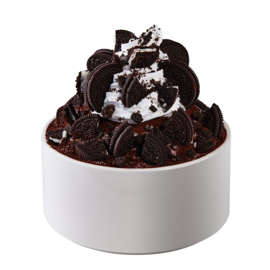外径約15㎝、高さ外径7cm、内容量が液体約1リットル分ある特製の器に、スポンジケーキやソルビンおなじみのパウダースノーのようなふわふわとしたミルクかき氷、バニラアイス、たっぷりの砕いたオレオ、カカオパウダー、チョコソース、生クリーム、さらに上にもオレオをたっぷりと盛りつけた、モンスター級の迫力ある一品。