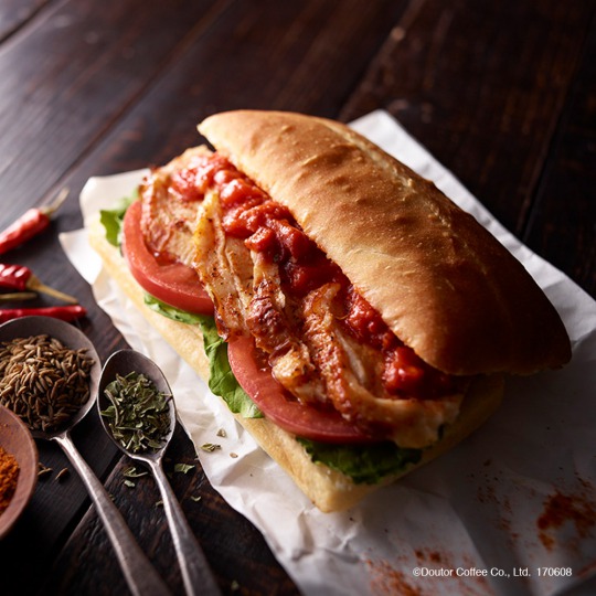 柔らかくジューシーなチキンに、パプリカ、胡椒、ガーリックなどを使用したケイジャンスパイスを合わせた。一緒にサンドしたスライストマトのみずみずしさと酸味で、爽やかさをプラスしている一品。