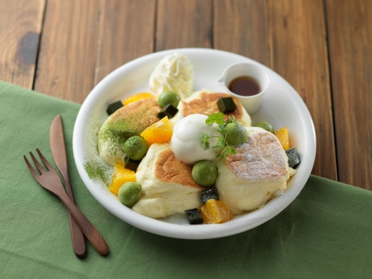 新作のパンケーキ2品目は、北海道十勝加藤牧場のジャージーミルクと、愛知県南山園の西尾の抹茶、こだわりが詰まった2つの厳選素材の美味しさとルタオのパンケーキがマリアージュ。散りばめた抹茶のアイスには、「碾茶(てんちゃ)」を使用した。碾茶は抹茶の原料で、丁寧に石臼挽きにすることでお茶の粒子が大変細かくなり、口当たりや味わい、豊かな香りが特長。この抹茶の風味とパンケーキのバランスにこだわった一品。ほろ苦い抹茶ゼリーとジューシーなオレンジをトッピングして仕上げている。