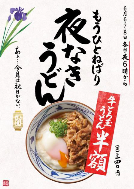 株式会社トリドールホールディングスが展開する讃岐うどん専門店「丸亀製麺」では、一年のうち唯一祝日がなく、ジメジメとした 6月に活力を与える企画として6月6日~8日の3日間限定で、各日18時以降『牛とろ玉うどん』を半額で提供する。