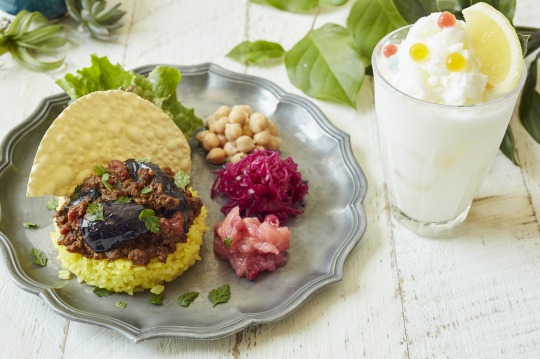 個性的な2種類のカレーには、それぞれに色鮮やかなデリを添えて、見た目からカラフルなビジュアルに仕上げている。クミンやシナモンをアクセントに加えた自家製のフルーツチャツネを混ぜて食べるとマイルドな味わいにも。新作カレーには、「カルピス」とヨーグルトで作るラッシーに、たっぷりの「カルピス」シャーベットをのせた「『カルピス』のシャーベットラッシー」を。スパイスを効かせたカレーに、甘酸っぱくて爽やかな味わいが相性ぴったり。アフタヌーンティーおすすめのペアリングで、COOLな夏を提案する。