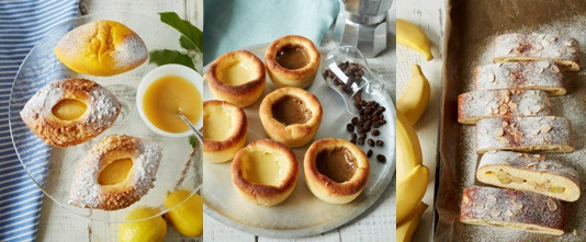 ベイカリーの夏のトレンドとして定番人気になった“冷やしても美味しい”パンに、この夏、新商品が登場。バニラビーンズ入りのカスタードクリームを入れて焼き上げた「とろりカスタードクリームパン」、マスカルポーネとエスプレッソの自家製クリームをたっぷり入れて焼き上げた「とろりエスプレッソ&マスカルポーネクリームパン」、どちらも冷やすことで更に美味しく、スイーツ感覚で味わえる一品。そのほか、毎年人気の「マンゴーヨーグルト」や、表面のサクサクがアクセントの「レモンカードクリームパン」など、夏らしいテイストのラインナップがベイカリー店舗に登場する。