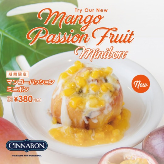 シナモンロール専門店「Cinnabon/(以下:シナボン)」を運営するブランドパートナーズ株式会社は、アツアツのシナモンロールにダイスカットしたマンゴーをトッピングした『マンゴーパッションミニボン』を、2017年7月1日(土)~2017年8月末日(予定)まで、4店舗にて期間限定新発売する。