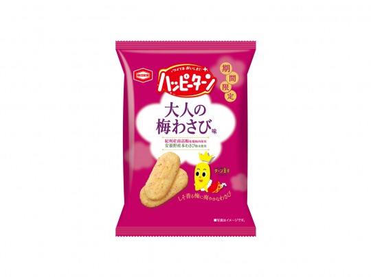 『ハッピーターン 大人の梅わさび味』は、香り高く風味豊かな紀州産南高梅の乾燥梅肉と、上品で爽やかな辛味の安雲野産本わさび粉末を使用した、梅の酸味とわさびの辛味がおいしい大人のハッピーターンとなっている。