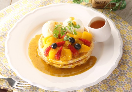 夏にぴったりのマンゴーをたっぷり使った「マンゴーとマスカルポーネのパンケーキ」は豪華な見た目と贅沢な味わいが楽しめる一品となっている。