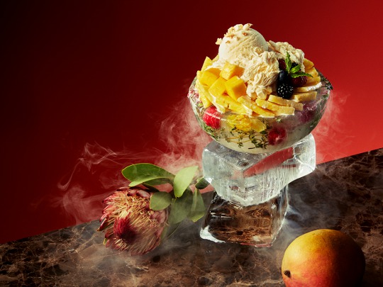「ハーゲンシェイブ バニラ」を注文すると、1日先着10名限定でフルーツや花が入った“氷の器” で提供。
