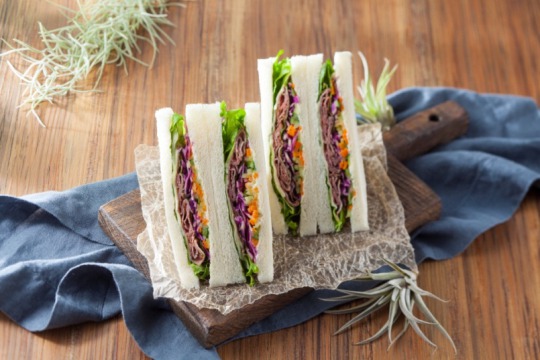 たっぷりの野菜を手軽に食べられるサラダ感覚のサンドイッチ。 レタス、グリーンカール、きゅうり、人参、紫キャベツ、パストラミポーク、チーズを具材に使用。すりおろした野菜入りのフレンチソースを使用した、さっぱりとした味わい。