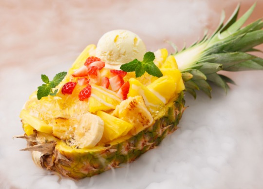 半割にしたパイナップルを器にして、Ivorish自慢のフレンチトーストとジューシーなパイナップル・バナナをたっぷりと詰め込んだ一品。トップにはキラキラのジュレとココナツソース、パイナップルとパッションフルーツのソースをかけてさらに爽やかさをプラス。アイスもパイナップルフレーバーで、どこを食べてもとってもパイナップルな一皿となっている。