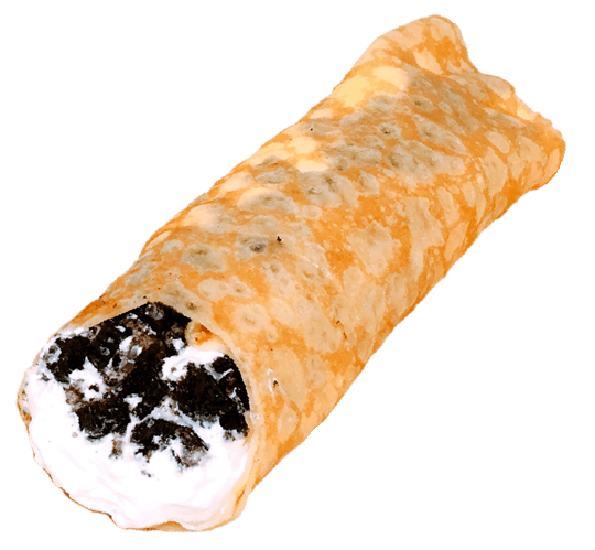 しっとりしたクレープ生地で、クラッシュしたオレオと甘みを抑えたバニラクリームをたっぷりと入れ包んだ。