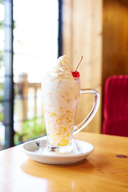 マンゴーの王様といわれるアルフォンソマンゴーの果肉を使用したジェリーに、相性抜群のヨーグルトを組み合わせた一品。仕上げに口あたりの良いホイップクリームと、真っ赤なチェリーをトッピング。マンゴーの果実味あふれる味わいと、さっぱりとした飲み心地はこれからの季節にぴったり。よくかき混ぜることで、ホイップクリームのまろやかさも楽しめるようになっている。
