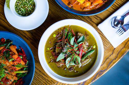 日本初出店となるモダン・タイ・レストラン「Longrain(ロングレイン)」はオーストラリアのシドニーにて、つねに満席となる活気あふれる大型ダイニング。鮮やかな色合いが美しく、アロマティックなスパイスの香りが魅力的な大皿料理をモダンにデザインされた空間で楽しめるようになっている。