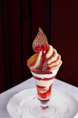 旬のいちじくをフレッシュ、赤ワインのコンポート、ロゼワインのコンポートなど様々なタイプで味わえるパフェ。なかでもフレッシュを贅沢に使い、いちじくそのものを楽しめるよう工夫した。いちじくのシャーベット、フランボワーズ、赤スグリとともに盛り付けた見た目も情熱的なパフェとなっている。