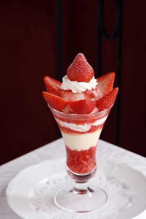 信州畑工房が所有する資生堂パーラー専用のハウスで採れた「夏秋いちご“恋姫”」を使った逸品。この地域独特の気候だからこその夏から秋でも美味しい苺は酸味が少なくまろやかな味わい。関東では珍しい希少な品種を使いパフェに仕立てた。