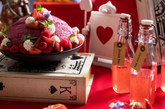 ソーシャルメディアでアップされた画像が話題になる今、帽子屋たちとのへんてこなお茶会、ハートの女王様の庭、物語の鍵となるボトル『ドリンクミー(私を飲んで)』などからアイデアを得たフォトジェニックなデザートを、ヒルトン大阪のペイストリーシェフ 百田 利治(ひゃくだ としはる)が創作する。トランプの兵隊がせっせとバラに色を付けるシーンを模した「赤く塗っちゃえローズムース」は、バラ型のホワイトチョコムースにライチの香りがアクセントになっている。アリスが助言をもらう「イモムシ」をイメージした「むにゅむにゅイモムシムース」は、独特の食感を楽しめるようになっている。ベリーをたっぷりあしらった「女王様のプディング」や「ストロベリーショートケーキトランプの兵隊」などデザートは約20種。サンドウィッチやキッシュなどの軽食も揃う。