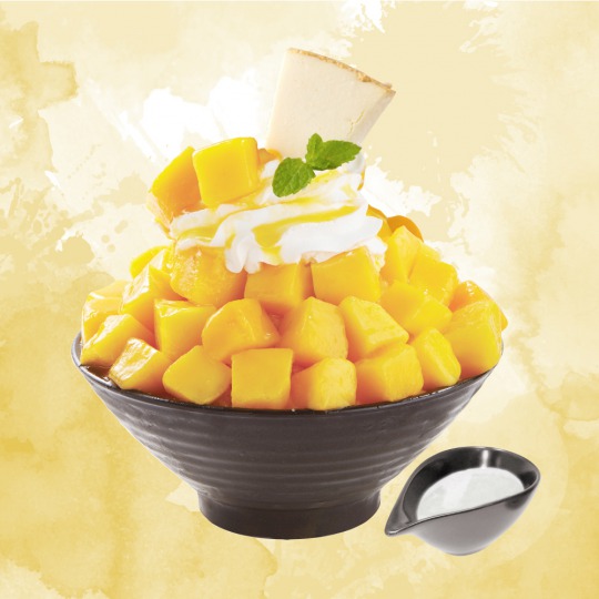 ふわふわのミルクかき氷に、ジューシーなマンゴー、生クリーム、そしてチーズケーキを大胆にトッピングした、 ボリューミーな一品。別添えのココナッツソースをかけるとさらに風味豊かな味わいに。