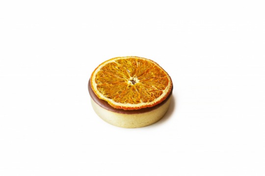 カオ分61%と70%のビターチョコレートで作った「アロマ生チョコ」ベースのとろりとなめらかなフィリングを さっくりと焼いたタルト生地に流し込み、コーティング。上には自家製のドライオレンジをトッピングした。