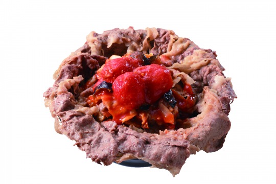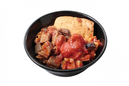 夏バテ予防に夏野菜をトマトで煮込み、にんにくを効かせた味付けで岡むら屋の肉めしと一緒にボリュームたっぷりに盛り付ける。トマトはリコピンの抗酸化作用に加えビタミンやミネラル豊富でペクチン(食物繊維)も含む健康野菜。暑い夏にさっぱりと味わうことができるようになっている。