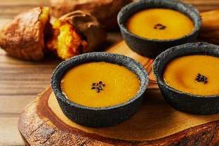 黒胡麻を練り込んだタルト生地に、鹿児島県産安納芋入りクリームとカスタードクリームをあわせた一品。芋の本来の甘さを味わえるようになっている。