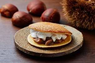風味が豊かでコクのある味わいが特長のイタリア産栗のペーストと北海道産生クリーム入りのホイップクリームを、山芋を使用したもっちりとした食感のどら焼生地で挟みこんだ一品。