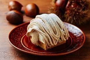 キャラメルを使用したアーモンド生地にムースをのせ、スペイン産栗を使用した風味豊かなマロンクリームを上から絞った一品。