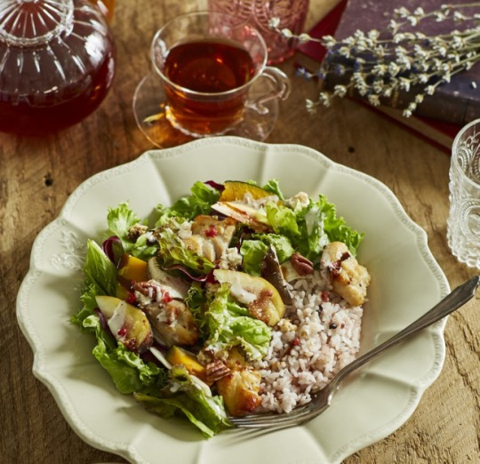 ・詳細 :十穀ごはんに、ローストチキン、いちじく、かぼちゃ、香ばしく焼いたキャラメルナッツ&クリームチーズをトッピング。コクのあるメープルナッツと酸味のあるバルサミコ、2種類のドレッシングが相性抜群のサラダライス。