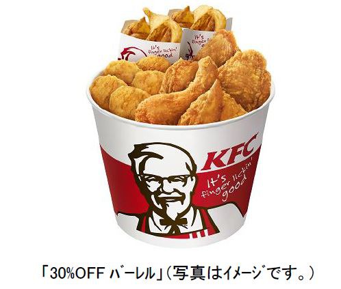 「30%OFF パック」、「30%OFF バーレル」は、国内のKFC登録飼育農場で大切に育てたハーブ鶏を、KFC創業者カーネル・サンダース秘伝の11種類のハーブ&スパイスで味付けし、店舗で1ピースずつ丁寧に手づくり調理する、こだわりのおいしさ「オリジナルチキン」に、人気のサイドメニューを組み合わせ、通常税込価格から30%OFFの価格で提供するお得なパック。