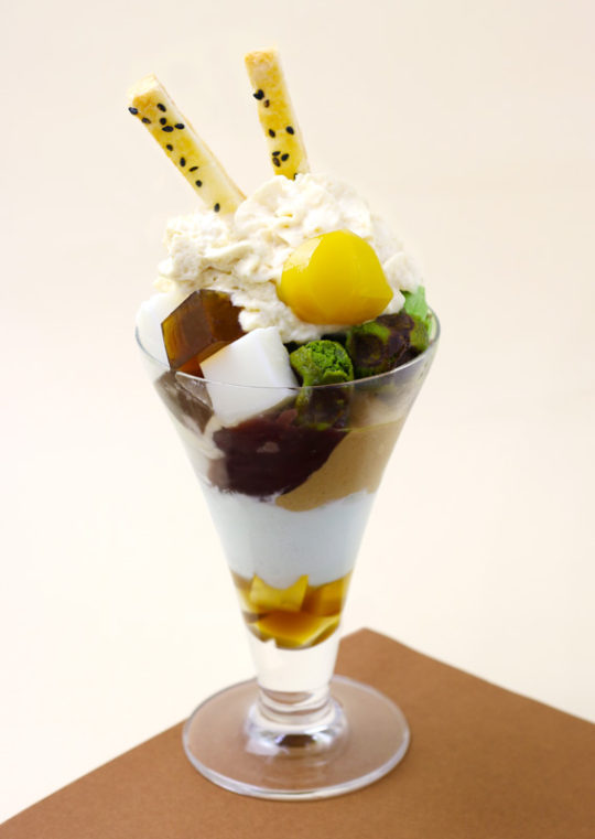 初秋をイメージした、ごまの風味豊かなパフェ。黒ごまのパイ、白ごまのクリームのほか、玄米茶ワッフルや、黒糖きな粉ぷりんなどたくさんの食材を使い、塩アイスでさっぱりと仕上げた。