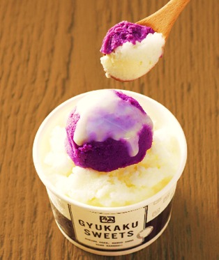 まさに紫いも、と感じさせる食感と味わいを楽しめるアイス。紫いもと氷ミルクのやさしい味わい、そして中間にサンドされているバニラアイスがたまらない、西洋風かき氷と紫いものマッチングが楽しめる。