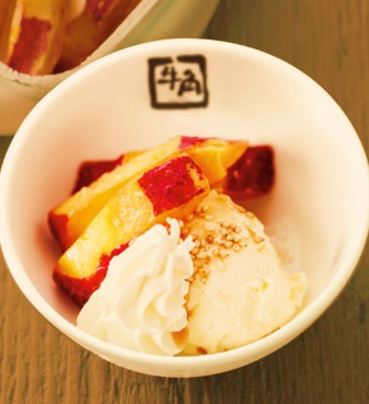 昔から根強いファンがいる黒糖おさつバター。この黒糖おさつバターを七輪でアツアツほくほくにしてバニラアイスと生クリームと一緒に。