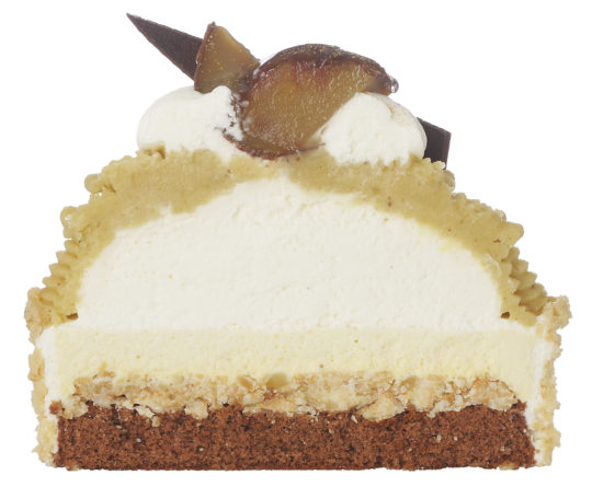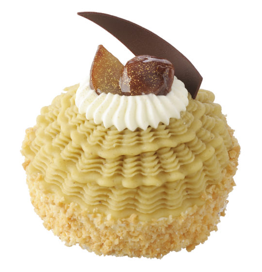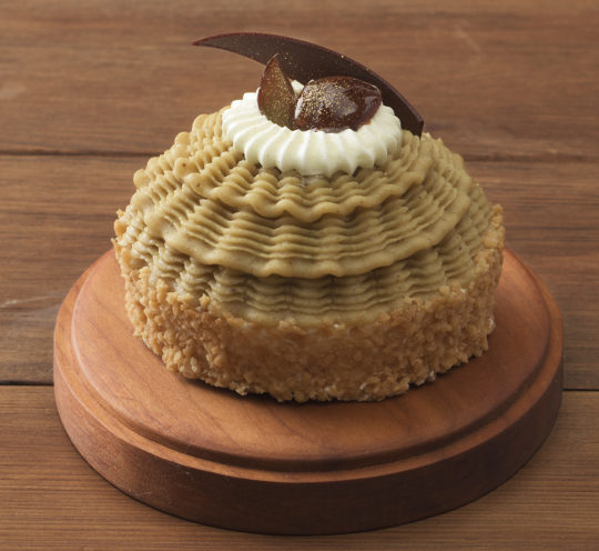 上品な甘みと香り、ほんのり渋みが特長の熊本産和栗をクリームとムース、トッピングにも使ったモンブラン。栗本来の自然な甘みとコクを引き立てるため素材の配合、バランスにこだわった。マカダミア入りホワイトチョコフレークが食感のアクセント。