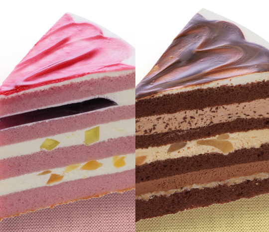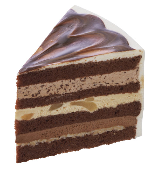 チョコチップ入りチョコクリーム、洋梨入りキャラメルクリーム、ビターチョコクリームをココアスポンジでサンドした。3種類のクリームのおいしさを層で楽しむショートケーキ。